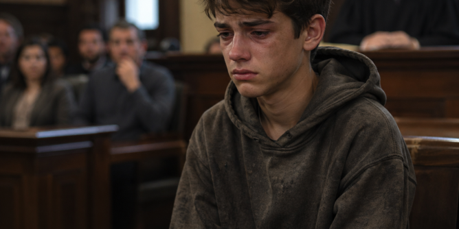 On the defendant’s bench sat a boy — thin, wearing an oversized, worn-out hoodie. His hands trembled slightly. He couldn’t have been more than fifteen.